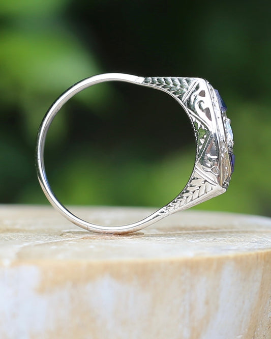 Art Deco Diamond and Sapphire Trilogy in Raised Handmade Engraved Floral Setting, 14ct White Gold, size U or 10 - offering free resize down to 7 or O, with valuation