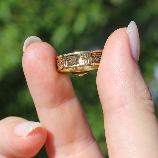 Antique 1915 Mourning Hair Ring for Two Siblings in WW1, 15ct Yellow Gold, 1915, size O or 7.25