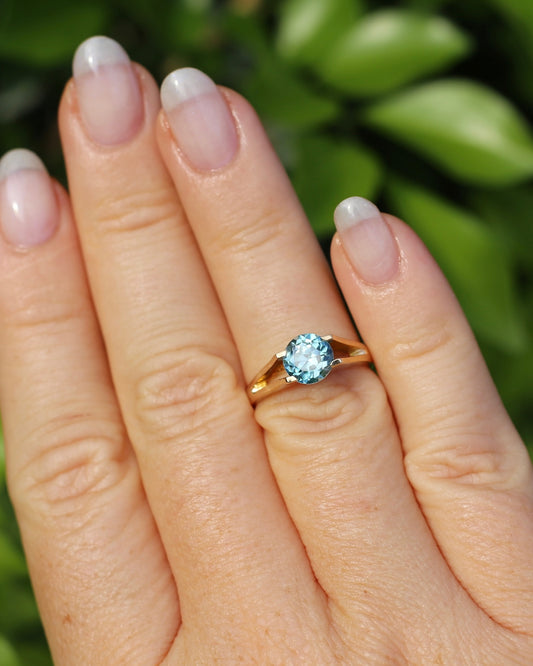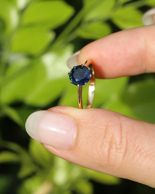 2.2ct Round Blue Zircon in Fabulous Claw Set Tall Ring, 14ct Yellow Gold, size M or 6.25