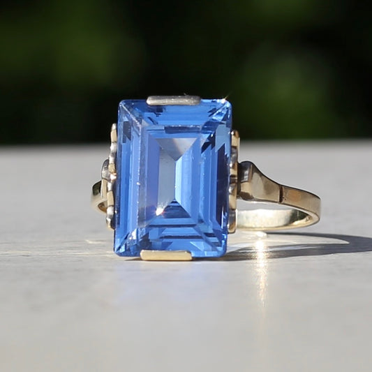 Pre 1953 Rectangular Step Cut Blue Dutch Spinel Ring, 14ct Yellow Gold, size S or 9