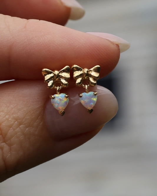 Solid Opal Heart and Gold Bow Earrings, 14ct Yellow Gold, 2.14g