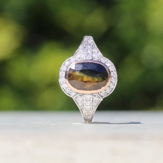 East African 1.98 Dark Teal Parti Sapphire 14ct White and Rose Ring, size N1/2 or 7 with valuation