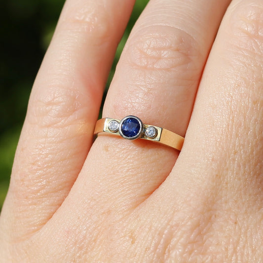Bezel Set Sapphire and Diamond Trilogy Ring, 14ct Yellow and White Gold, size O1/2 or just over 7.25