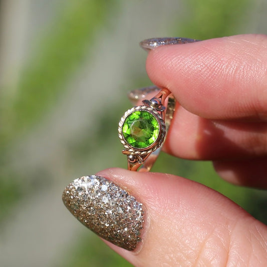 Bezel Set Vintage Green Glass Ring with Floral Shoulders, size L1/2 or 6