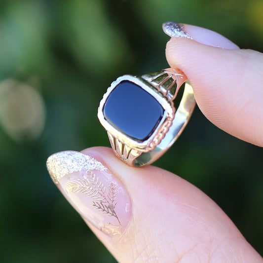 Vintique Onyx Signet Ring with Engraved Shoulders, 9ct Rosey Gold, size K1/2 or 5.5