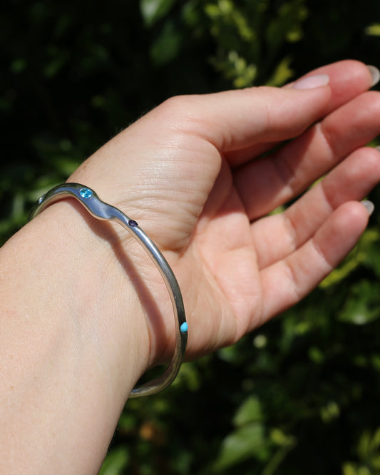 Irregular Handmade Chunky Sterling Silver Bangle with Sapphires and Topaz, 42.6g