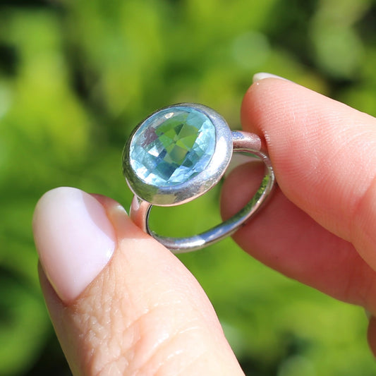 Bezel Set Harlequin Cut Blue Topaz Ring, Sterling Silver, size O or 7.25 (fits bigger)