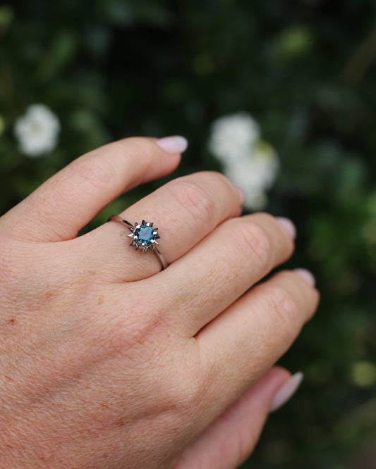 Teal and Bluey Purple Parti Sapphire Solitaire, 18ct White Gold, size R or 8.5