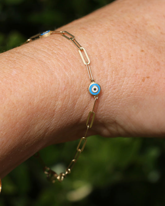 Delicate Paperclip and Enamel Evil Eye Bracelet, 9ct Yellow Gold, 19.5cm or 7.75inches