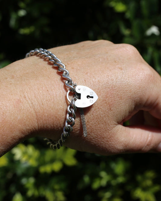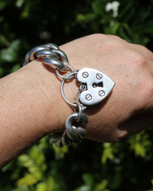 1978 London Made Gate Bracelet with Heart Padlock and Safety Chain, 19cm, 24.7g