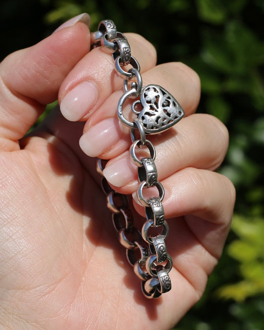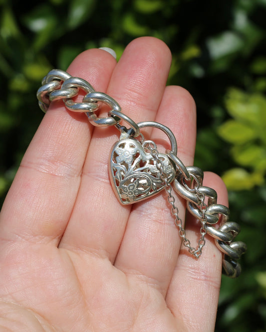 Chunky Curb and Filigree Heart Padlock Bracelet, Sterling Silver, 60.2g