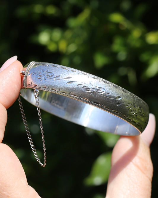Vintage Hinged Engraved Silver Semi Hollow Bangle, Sterling Silver, 19.2g