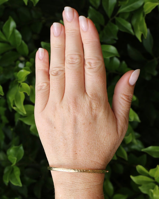Decorative Engraved Oval 9ct Coil Bangle with Safety Clasp, British Made, 9ct Yellow Gold,4.41g