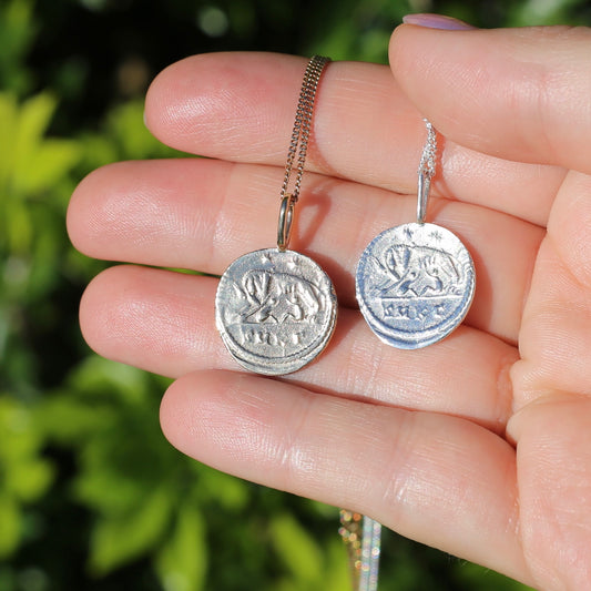 Duo - the Myth of Rome - Romulus, Remus and the Shewolf Pendant, Cast from a Bronze Roman Coin 334AD avail in Silver and Gold