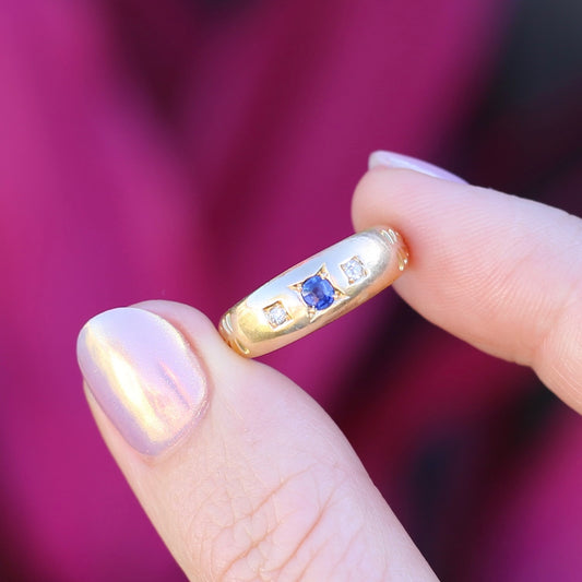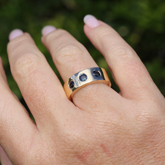 Reclaimed Gold Chunky 9ct Ring with 3 x 4mm Punch Set Parti Sapphires, 11.9g size Q