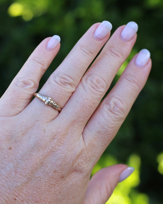 Antique 1898 Old Cut Diamond Star Set Carved Ring, 18ct Yellow Gold, size M1/2 or just under 6.5, 2.74g