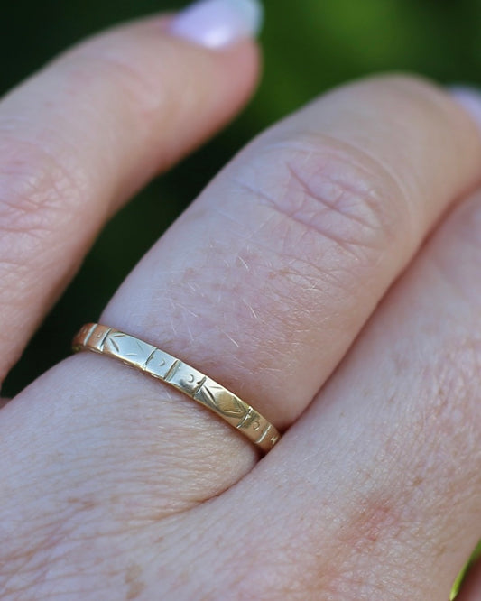 Early Australian "APEX" Patterned Wedder by Rodd and co., 18ct Yellow Gold, size O or 7.25, 2.3g
