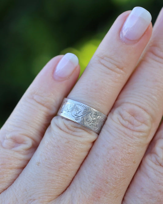 Vintage Hand Engraved Leaf Pattern Ring, Sterling Silver, size M or 6.25 (fits more like an K1/2 or L), 2.3g