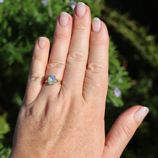 Vintage Solid Grey Opal with Amazing Colour Play in Double Set Claws, 9ct Yellow Gold, size Q or 8
