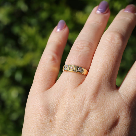 Antique Pearl and Old Cut Diamond Set Trilogy Ring, 18ct Yellow Gold, size N1/2 or 7