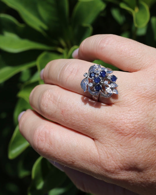 Vintage Blue Sapphire and White Quartz Leaf Ring, Sterling Silver, size Q or 8.25, 5.55g