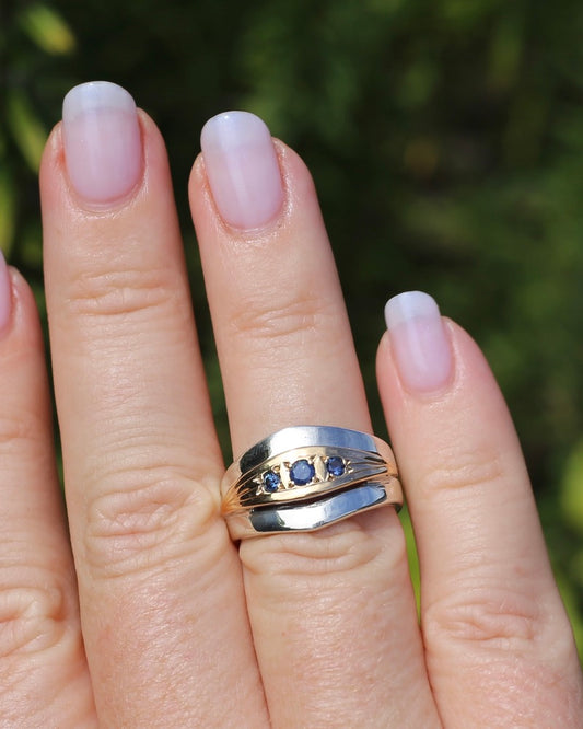 Mixed Metal Wide Band Featuring 3 Rubyvale Sapphires Mined in 1992, Sterling Silver and 14ct Yellow Gold, size O or just over 7 (fits more like an M1/2 or N), 6.81g