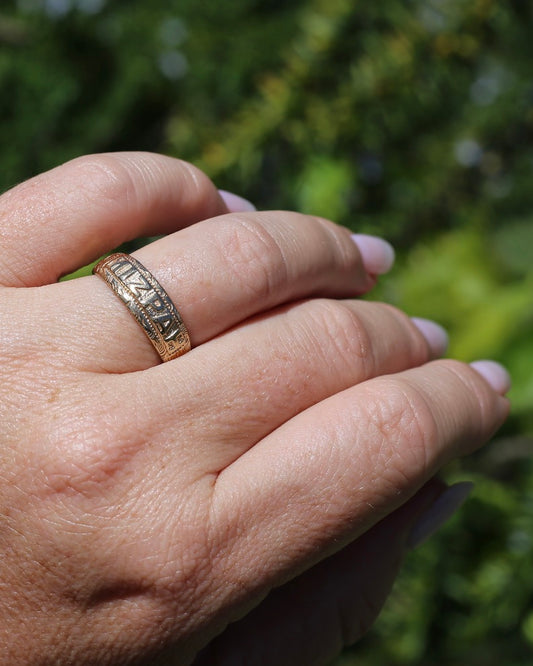 Vintage Hand Carved "MIZPAH" Ring, 9ct Yellow Gold, size Q or just over 8, 4.9g