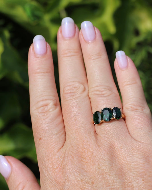 Glorious 5.18ct Tsavorite Green Garnet Trilogy Ring, 9ct Yellow Gold, size O1/2 or just over 7.25, 2.9g, with valuation