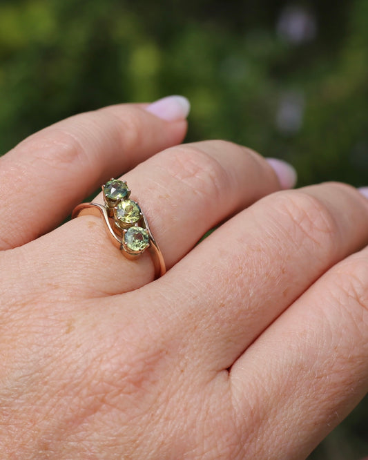 Old Cut Parti Sapphire Trilogy in a Multi Claw Set Bypass Style Ring, 15ct Old Rosey Gold, size M1/2 or 6.5, 2.99g