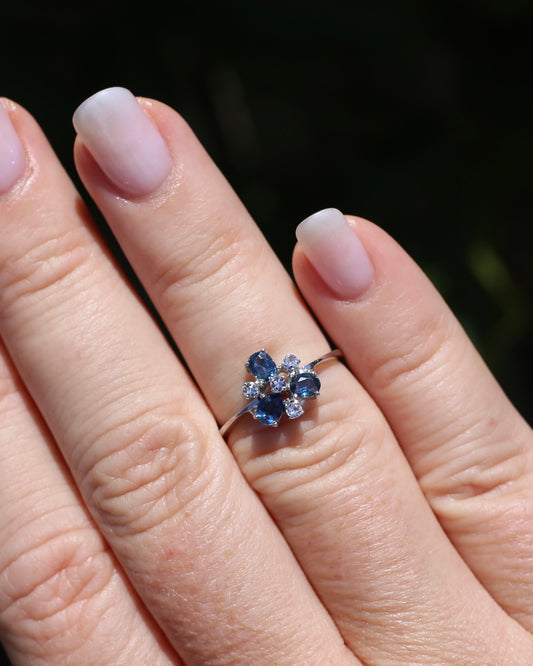 Vintage Parti Sapphire and White Quartz Cluster Ring, 9ct White Gold, size M or just over 6, 1.7g