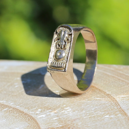 Vintage Chunky Cartouche Ring with Scarab Beetle, 9ct Yellow Gold, size 9.5 or S1/2