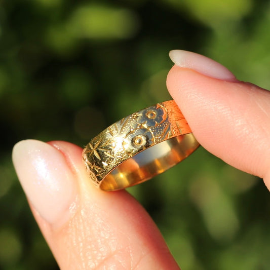 1964 22ct Half Round Band with Crisp Floral Engravings, size U1/2 ot 10.5 (fits about T1/2 or 9.75)