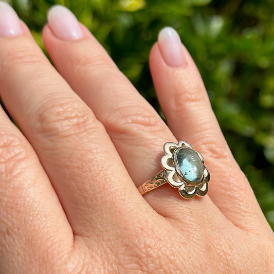 2.35ct Natural Aquamarine Cabochon in Vintage Floral 9ct Gold Ring, size O or 7.25