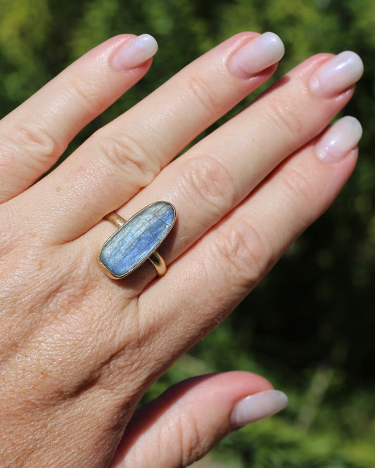 Rustic Freeform Labradorite Cabochon in Bezel Setting, 9ct Yellow Gold, size X1/2 or 11.75
