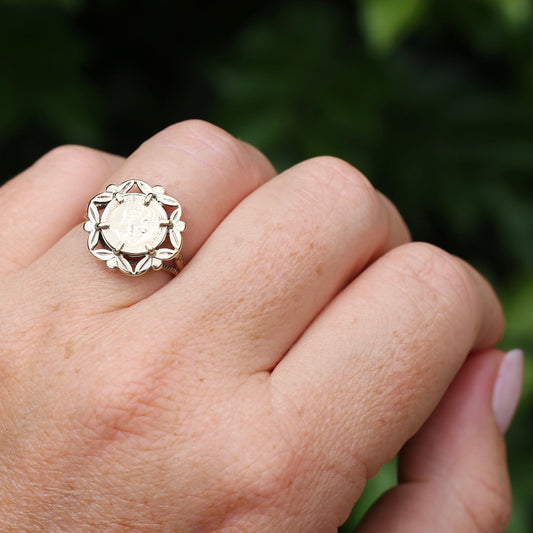 1985 London Made Replica Mexican Coin Ring in Glorious Leaf Surround, size O or 7.25