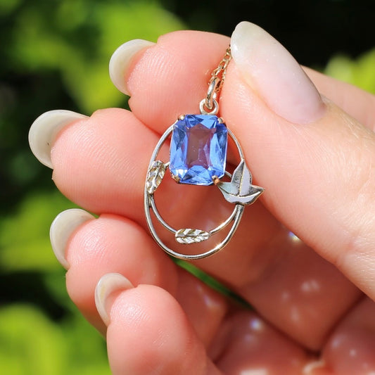 1930s -1950s Arts & Crafts Blue Paste Pendant in Decorative 9ct Gold Leaf Surround, 1.75g