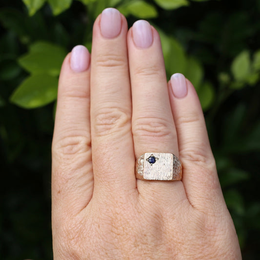 Vintage Bark Signet Ring with Natural Star Set Sapphire, 9ct Yellow Gold, size R or just over 8.5
