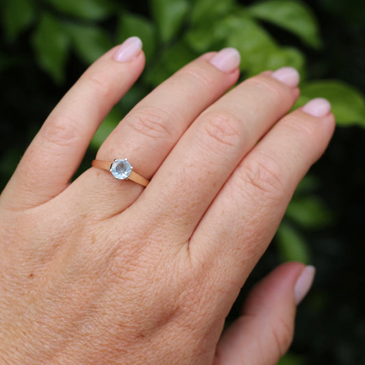 ON HOLD Round Natural Aquamarine Solitaire, 9ct Yellow and White Gold, size O or 7.25