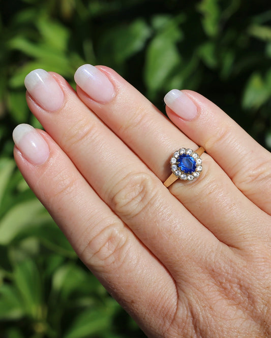 Synthetic Spinel and White Quartz Halo, 9ct Yellow Gold, 1989 Made Birmigham, size N or 6.75