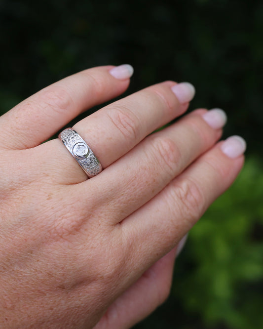 Bezel Set Old European Cut Diamond, in Pavé Setting of Diamonds, Chunky Platinum, size Q or 8 (fits more like an O1/2 - P), with valuation