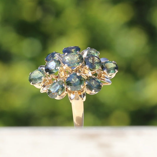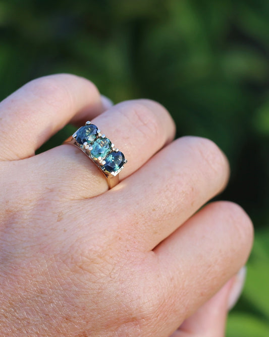 East African Emerald Cut Teal Parti Sapphire in 1940s Italian Made 18ct Mixed Metal Handmade ring, size S or 9.25 with valuation