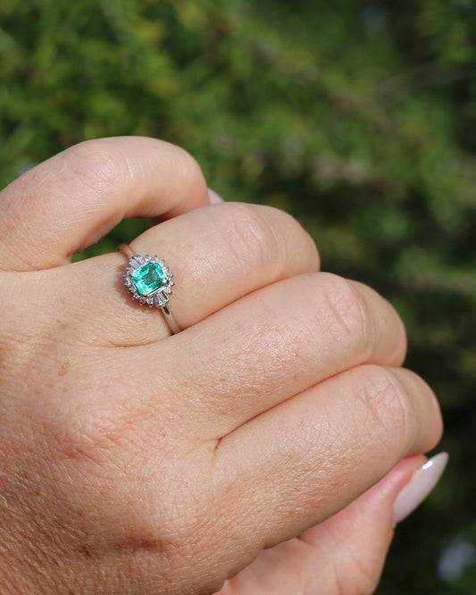 Natural Square Step Cut Emerald and Diamond Baguette Ballerina Skirt, Platinum Ring, size O or 7.25