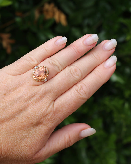 Oval Peach Tourmaline Ring with Pierced Wire Surrounds and Diamonds in the Shoulders, 9ct Yellow Gold, size N or 6.75