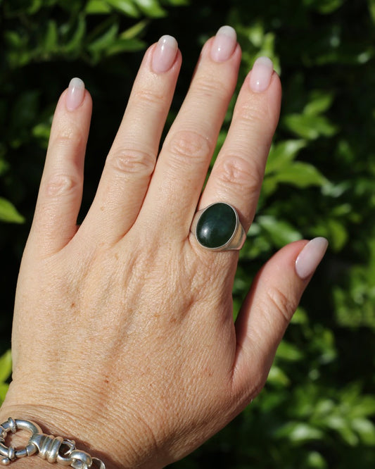 Vintage Bezel Set Nephrite Jade Cabochon Ring, Sterling Silver, size U1/2 or 10.25 (fits more like a T) 6.5g