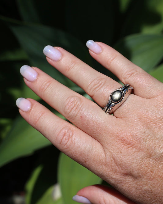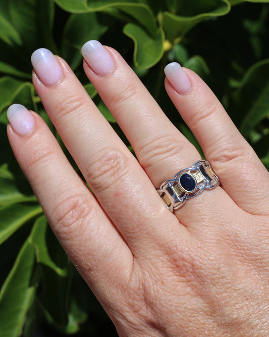 Amazing Chunky Silver and Gold Mized Metal Natural Star Sapphire Ring, size Q or 8 (fits more like a P1/2), 16.13g