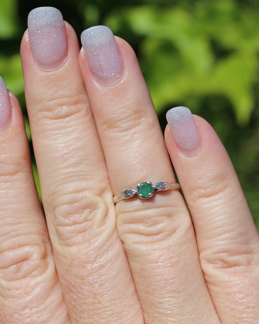 Vintage Natural Emerald Ring with Leaf Shoulder Details, Sterling Silver, size K or 5.25, 1.0g