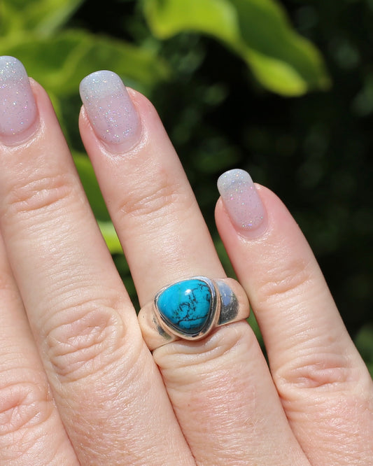 Vintage Chunky Curved Triangular Shaped Turquoise Cabochon in Bezel Set Silver, Sterling Silver, Size N1/2 or 6.75 (fits more like an M), 7.24g