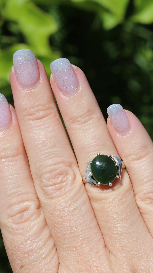 Vintage Nephrite Jade Cabochon Multi Claw Ring with Silver Leaf Shoulder Details, Sterling Silver, size N1/2 or 7 (fits more like M1/2 due to width), 3.71g