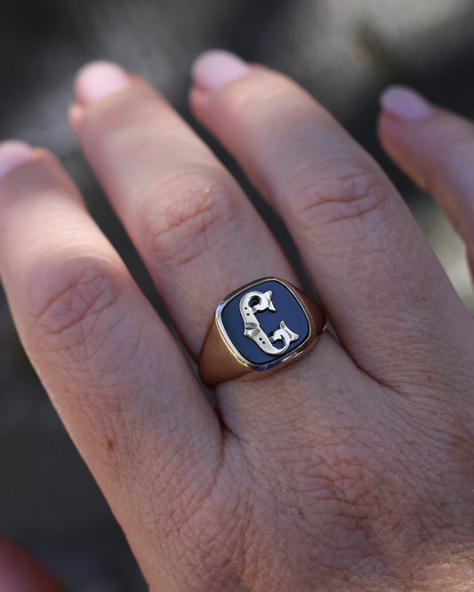 Vintage "C" Onyx Signet Ring, Bezel Set, Older Rosey Gold, size 9.5 or T
