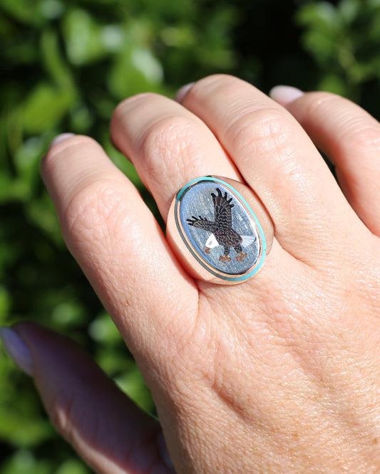 Navajo Artist Benjamin Becenti Inlaid Mother of Pearl and Turquoise Eagle Ring, Sterling Silver, size X1/2 or 11.75